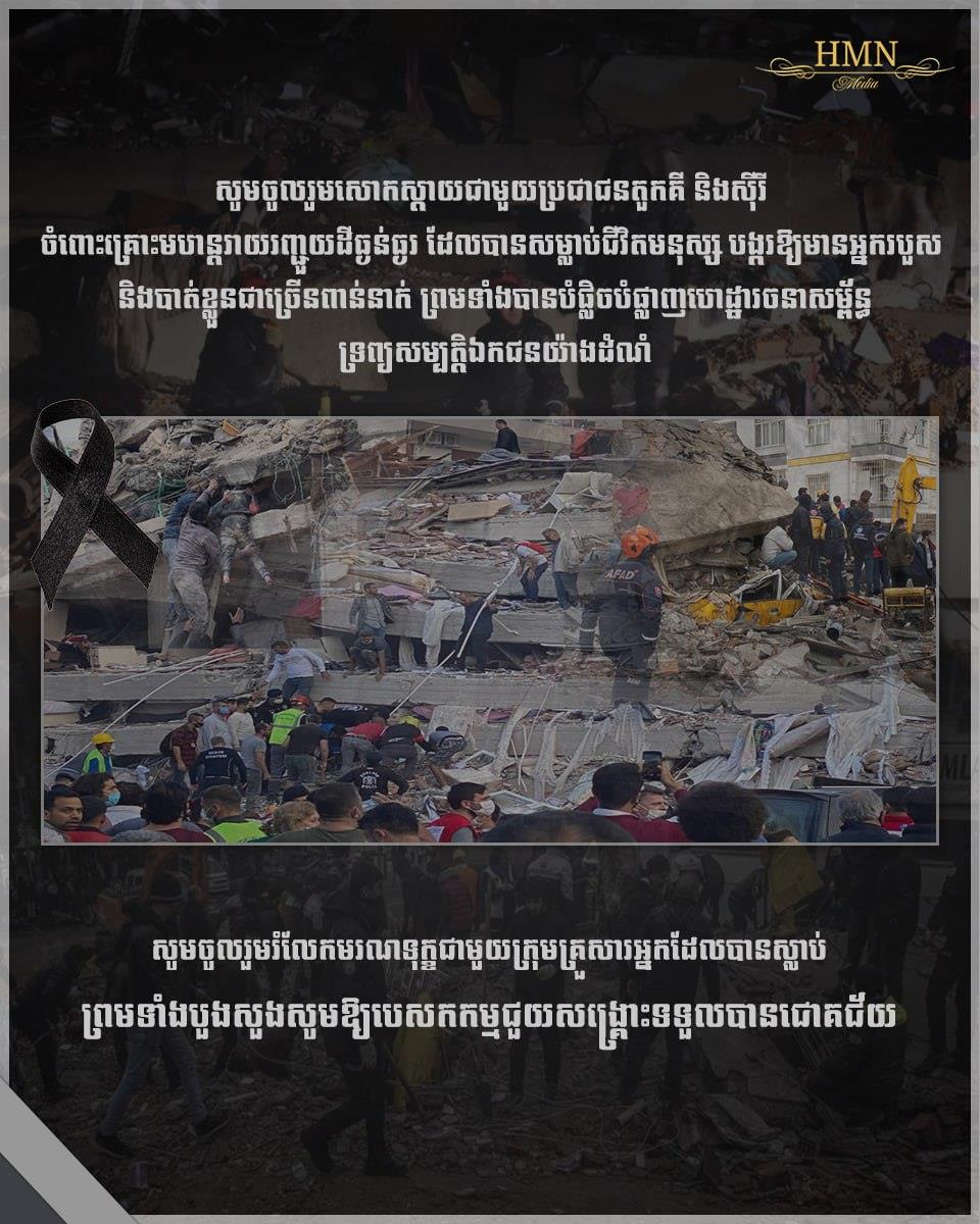 កម្ពុជាផ្តល់ជំនួយមនុស្សធម៌១០ម៉ឺនដុល្លារ ដល់តួកគី ដែលកំពុងជួបគ្រោះរញ្ជួយដី Posted on ថ្ងៃពុធ, 8 ខែកុម្ភៈ, 2023ថ្ងៃពុធ, 8 ខែកុម្ភៈ, 2023