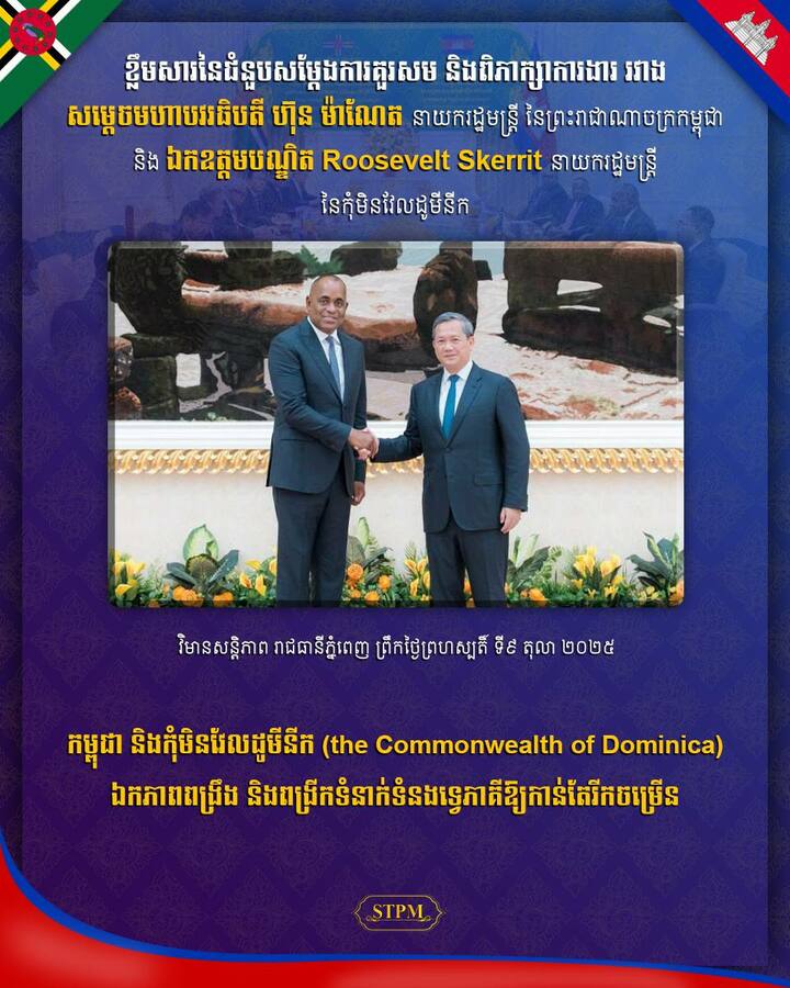 សម្តេចបវរធិបតី ហ៊ុន ម៉ាណែត ទទួលជួបពិភាក្សាការងារទ្វេភាគីជាមួយ នាយករដ្ឋមន្ត្រីនៃកុំមិនវែលដូមីនីកា នៅវិមានសន្តិភាព Posted on ថ្ងៃព្រហស្បតិ៍, 9 ខែតុលា, 2025ថ្ងៃព្រហស្បតិ៍, 9 ខែតុលា, 2025