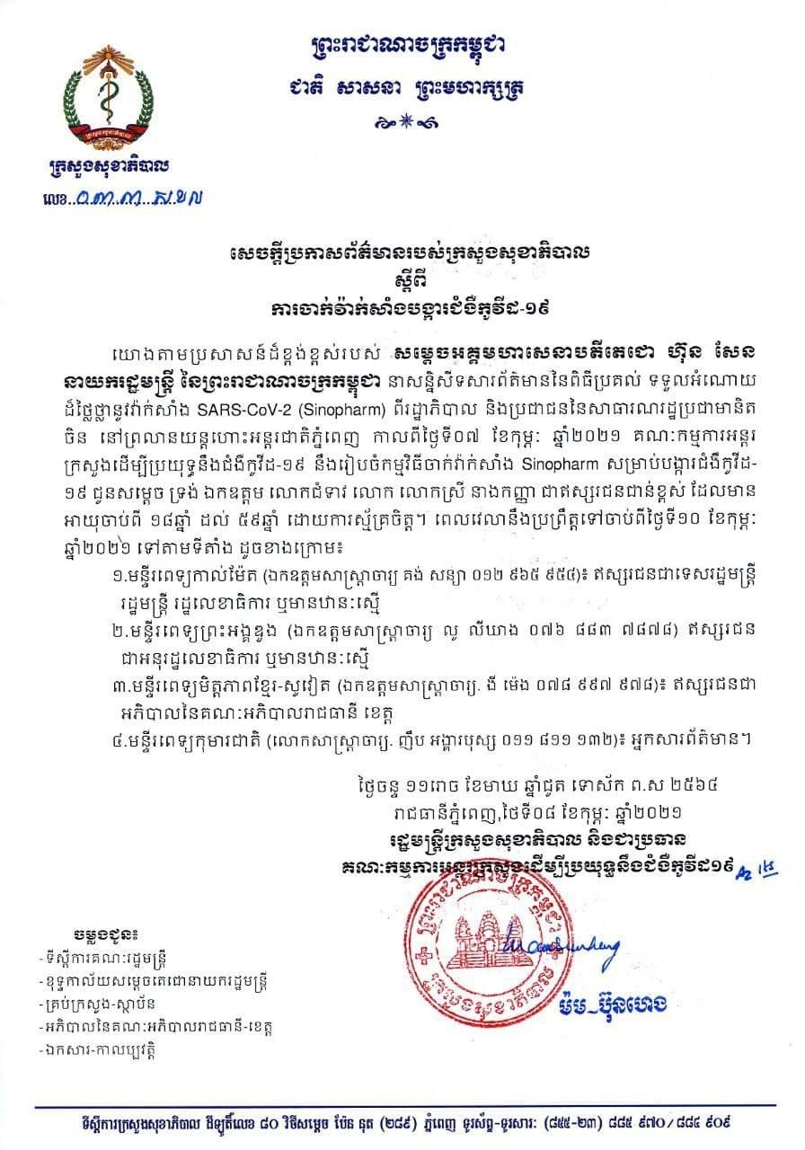 ក្រសួងសុខាភិបាលរៀបចំចាក់វ៉ាក់សាំង Sinopharm បង្ការកូវីដ១៩ ជូនឥស្សរជនជាន់ខ្ពស់ដោយការស្ម័គ្រចិត្ត ចាប់ពីថ្ងៃទី១០ ខែកុម្ភៈ នៅមន្ទីរពេទ្យ៤ទីតាំង Posted on ថ្ងៃចន្ទ, 8 ខែកុម្ភៈ, 2021ថ្ងៃចន្ទ, 8 ខែកុម្ភៈ, 2021