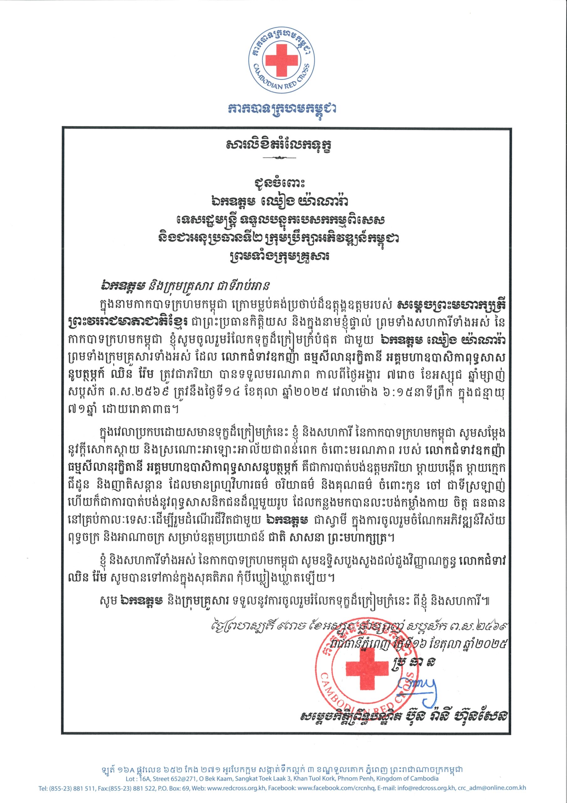 សម្តេចកិត្តិព្រឹទ្ធបណ្ឌិត ប៊ុន រ៉ានី ហ៊ុនសែន ផ្ញើសារលិខិតរំលែកទុក្ខជូន ឯកឧត្តម ឈៀង យ៉ាណារ៉ា ចំពោះមរណភាពលោកជំទាវឧកញ៉ា ធម្មសីលានុរក្ខិតានី អគ្គមហាឧបាសិកាពុទ្ធសាសនូបត្ថម្ភក៍ ឈិន វ៉ែម Posted on ថ្ងៃសុក្រ, 17 ខែតុលា, 2025ថ្ងៃសុក្រ, 17 ខែតុលា, 2025