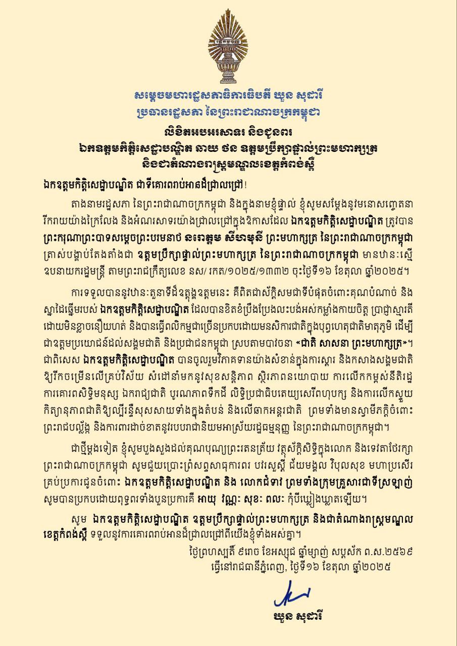 សម្តេចមហារដ្ឋសភាធិការធិបតី ឃួន សុដារី ផ្ញើសារលិខិតអបអរសាទរ និងជូនពរ ឯកឧត្តមកិត្តិសេដ្ឋាបណ្ឌិត ឆាយ ថន ដែលត្រូវបានព្រះមហាក្សត្រ ត្រាស់បង្គាប់តែងតាំងជាឧត្តមប្រឹក្សាផ្ទាល់ព្រះមហាក្សត្រ មានឋានៈស្មើ ឧបនាយករដ្ឋមន្ត្រី Posted on ថ្ងៃសុក្រ, 17 ខែតុលា, 2025ថ្ងៃសុក្រ, 17 ខែតុលា, 2025