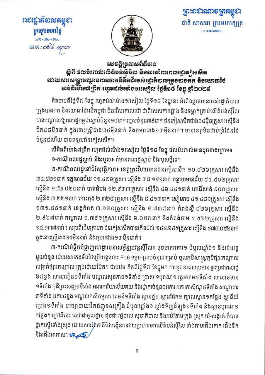 ក្រសួងមហាផ្ទៃ៖ ជនស៉ីវិលកម្ពុជា ១៨នាក់ស្លាប់, ៧៩នាក់រងរបួស និង៤៨ម៉ឺននាក់ត្រូវបានជម្លៀស ដោយសារទាហានថៃឈ្លានពានទន្ទ្រានទឹកដីកម្ពុជា Posted on ថ្ងៃព្រហស្បតិ៍, 18 ខែធ្នូ, 2025ថ្ងៃព្រហស្បតិ៍, 18 ខែធ្នូ, 2025