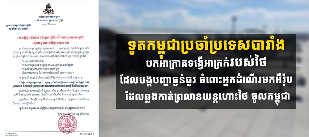 ទូតកម្ពុជាប្រចាំប្រទេសបារាំង បកអាក្រាតទង្វើអាក្រក់របស់ថៃ ដែលបង្កបញ្ហាធ្ងន់ធ្ងរ ចំពោះអ្នកដំណើរមកអឺរ៉ុប ដែលឆ្លងកាត់ព្រលានយន្តហោះថៃ ចូលកម្ពុជា Posted on ថ្ងៃព្រហស្បតិ៍, 18 ខែធ្នូ, 2025ថ្ងៃព្រហស្បតិ៍, 18 ខែធ្នូ, 2025