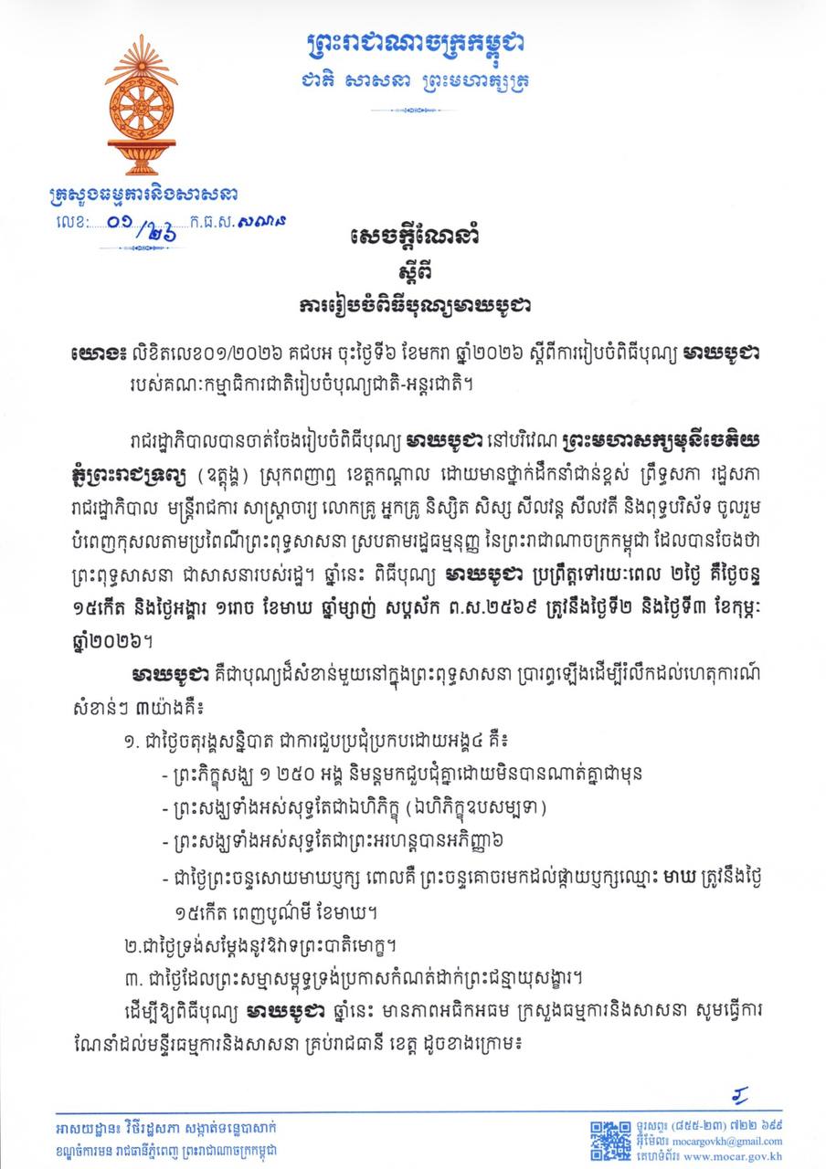 ក្រសួងធម្មការនិងសាសនា ចេញសេចក្តីណែនាំ ស្តីពី ការរៀបចំពិធីបុណ្យមាឃបូជា ព.ស.២៥៦៩ Posted on ថ្ងៃសុក្រ, 23 ខែមករា, 2026ថ្ងៃសុក្រ, 23 ខែមករា, 2026