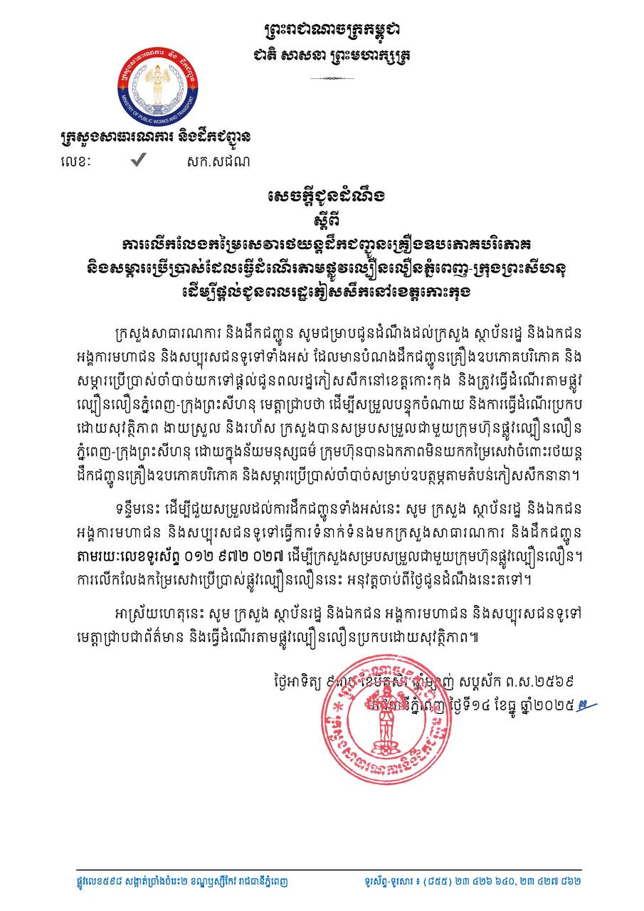 ក្រុមហ៊ុនផ្លូវល្បឿនលឿន សម្រេចមិនយកកម្រៃសេវា ចំពោះរថយន្តដឹកជញ្ជូនគ្រឿងឧបភោគបរិភោគ និងសម្ភារប្រើប្រាស់ ទៅឧបត្ថម្ភតាមតំបន់ភៀសសឹក Posted on ថ្ងៃចន្ទ, 15 ខែធ្នូ, 2025ថ្ងៃចន្ទ, 15 ខែធ្នូ, 2025