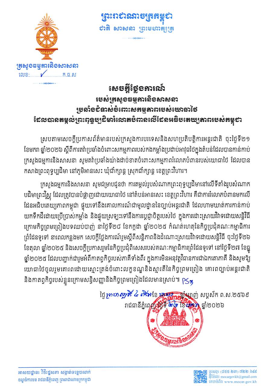 សេចក្តីថ្លែងការណ៍ របស់ក្រសួងធម្មការនិងសាសនា ប្រឆាំងជំទាស់ចំពោះសកម្មភាពរបស់យោធាថៃ ដែលបានតម្កល់ព្រះពុទ្ធប្បដិមារំលោភបំពានលើដែនអធិបតេយ្យភាពរបស់កម្ពុជា Posted on ថ្ងៃព្រហស្បតិ៍, 22 ខែមករា, 2026ថ្ងៃព្រហស្បតិ៍, 22 ខែមករា, 2026