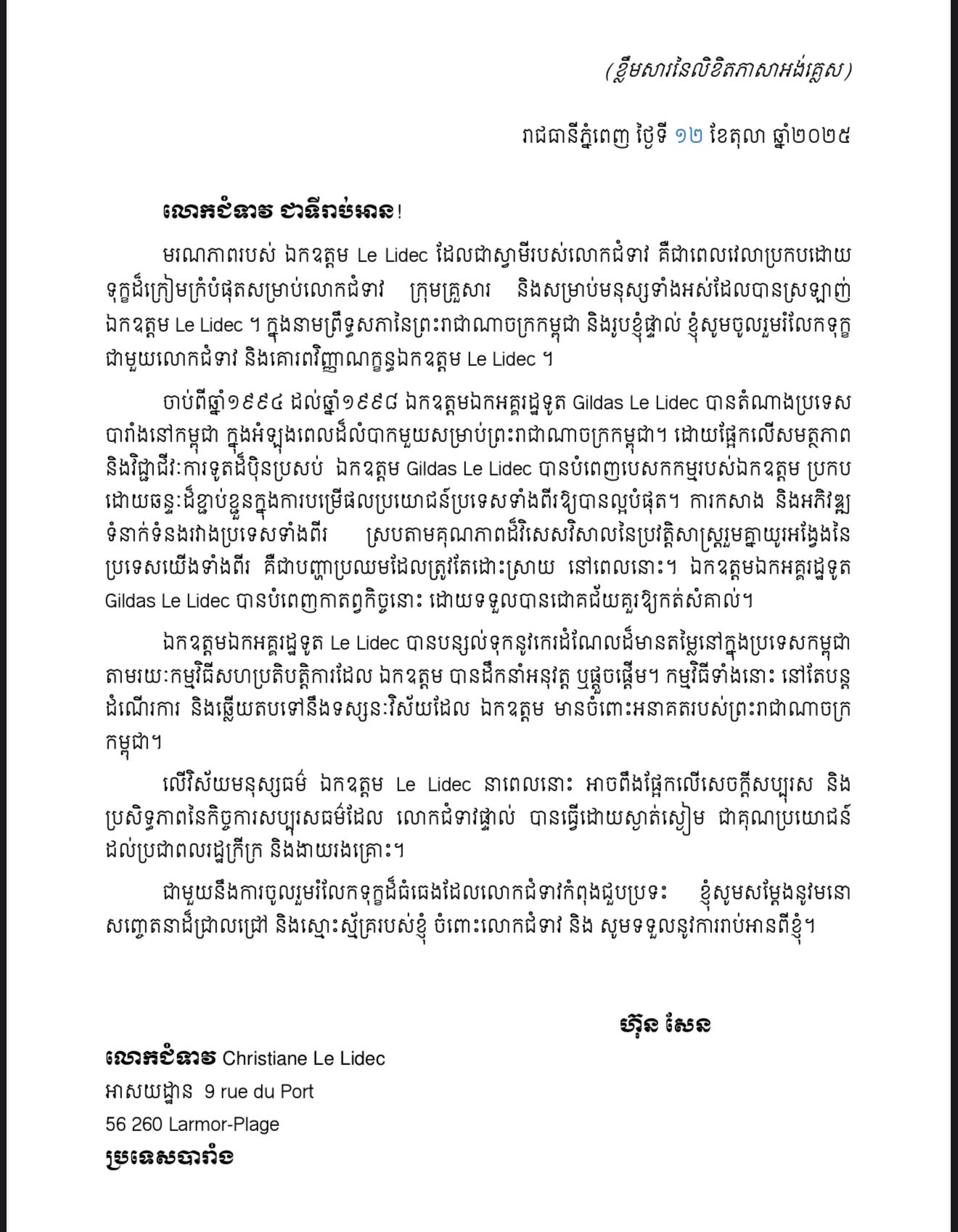 សម្ដេចតេជោ ហ៊ុន សែន ផ្ញេីសាររំលែកទុក្ខជូនលោកស្រី Christiane Le lidec ចំពោះមរណភាពអតីតឯកអគ្គរដ្ឋទូតតំណាងប្រទេសបារាំងនៅកម្ពុជា ដែលត្រូវជាស្វាមី Posted on ថ្ងៃចន្ទ, 13 ខែតុលា, 2025ថ្ងៃចន្ទ, 13 ខែតុលា, 2025