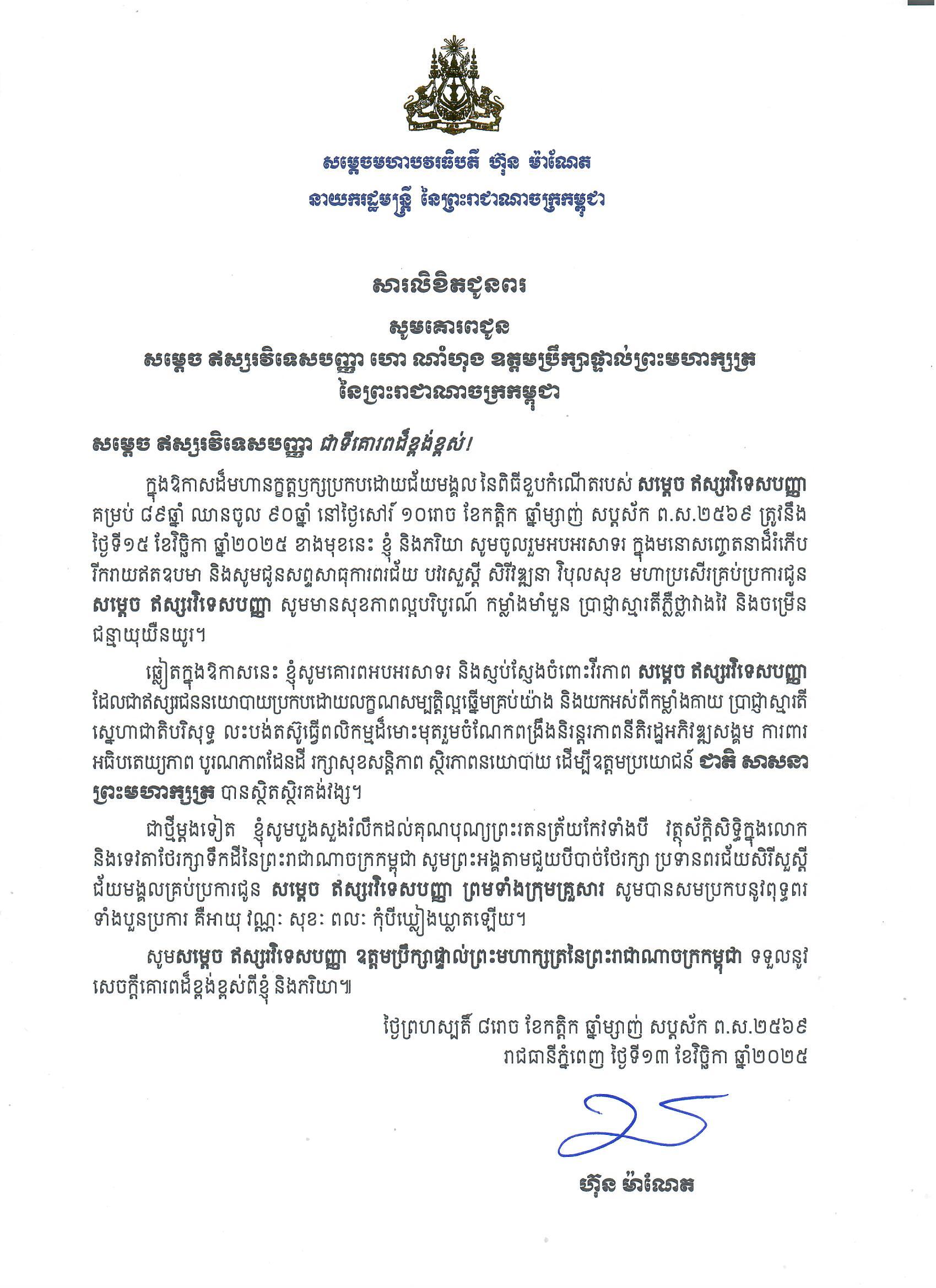 សម្តេចតេជោ ហ៊ុន សែន ផ្ញើសារលិខិតជូនពរសម្តេចឥស្សរវិទេសបញ្ញា ហោ ណាំហុង ក្នុងឱកាសខួបចម្រើនជន្មាយុ Posted on ថ្ងៃសុក្រ, 14 ខែវិច្ឆិកា, 2025ថ្ងៃសុក្រ, 14 ខែវិច្ឆិកា, 2025