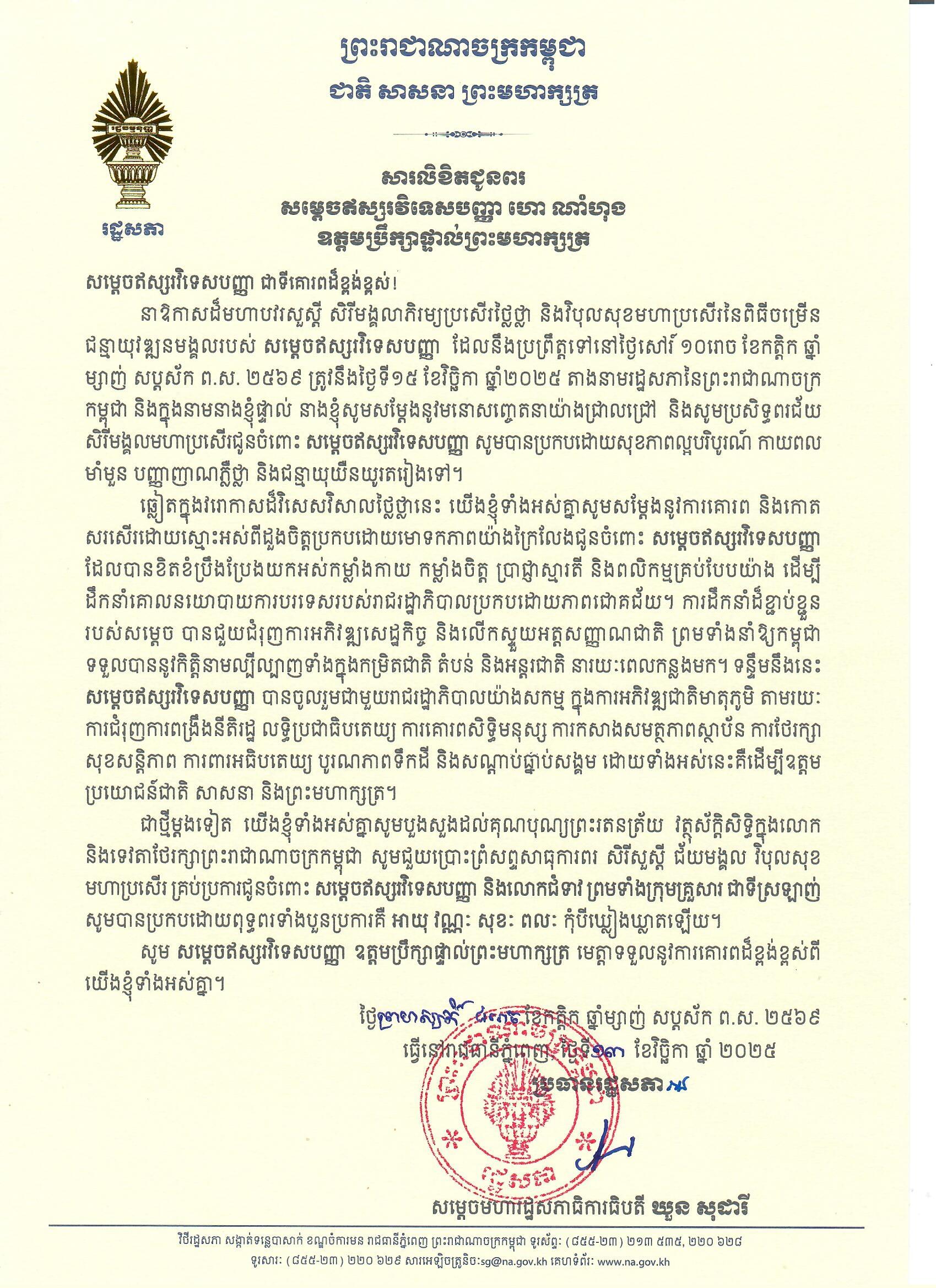 សម្ដេចមហារដ្ឋសភាធិការធិបតី ឃួន សុដារី ផ្ញើសារលិខិតជូនពរ សម្តេច ឥស្សរវិទេសបញ្ញា ហោ ណាំហុង ក្នុងឱកាសខួបកំណើត គម្រប់ ៨៩ឆ្នាំ ឈានចូល ៩០ឆ្នាំ Posted on ថ្ងៃសុក្រ, 14 ខែវិច្ឆិកា, 2025ថ្ងៃសុក្រ, 14 ខែវិច្ឆិកា, 2025