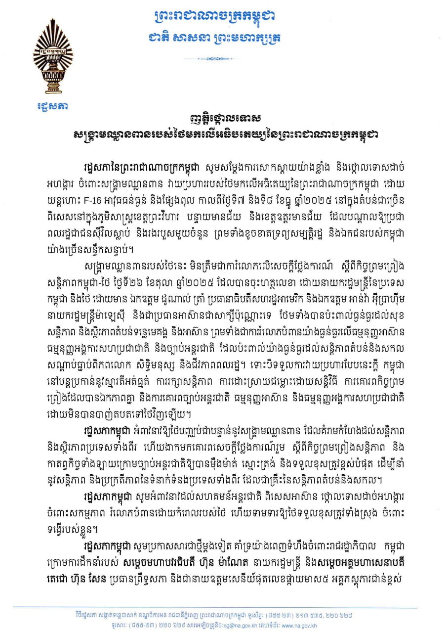 រដ្ឋសភា ចេញញត្តិថ្កោលទោស ចំពោះសង្គ្រាមឈ្លានពានរបស់ថៃមកលើអធិបតេយ្យកម្ពុជា ដែលបណ្តាលឱ្យប្រជាពលរដ្ឋជាជនស៊ីវិលរងគ្រោះ Posted on ថ្ងៃចន្ទ, 8 ខែធ្នូ, 2025ថ្ងៃចន្ទ, 8 ខែធ្នូ, 2025