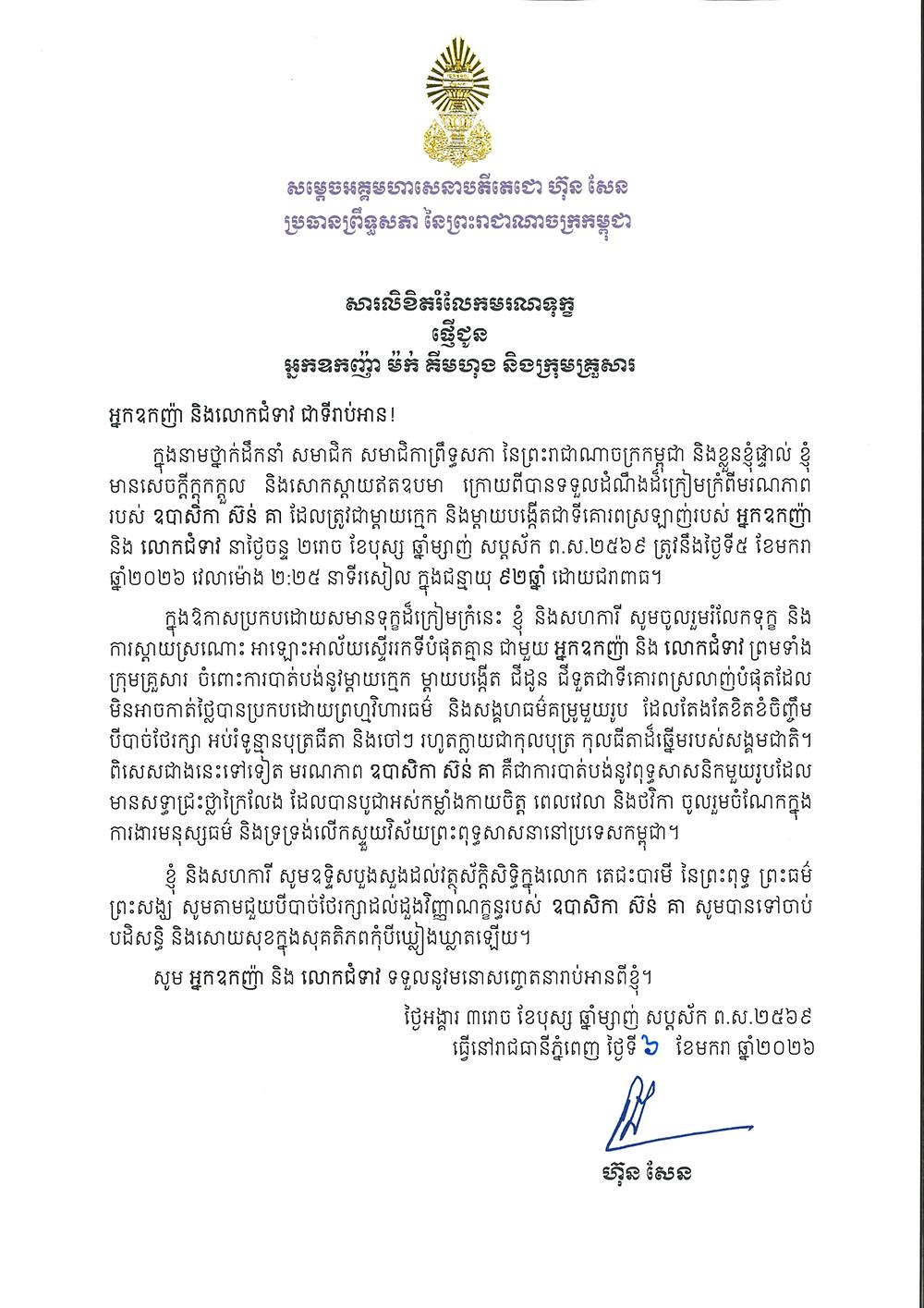 សម្តេចតេជោ ហ៊ុន សែន ផ្ញើសារលិខិតរំលែកមរណទុក្ខ ជូនអ្នកឧកញ៉ា ម៉ក់ គីមហុង ចំពោះមរណភាព ឧបាសិកា ស៊ន់ គា ដែលត្រូវជាម្ដាយក្មេក Posted on ថ្ងៃអង្គារ, 6 ខែមករា, 2026ថ្ងៃអង្គារ, 6 ខែមករា, 2026