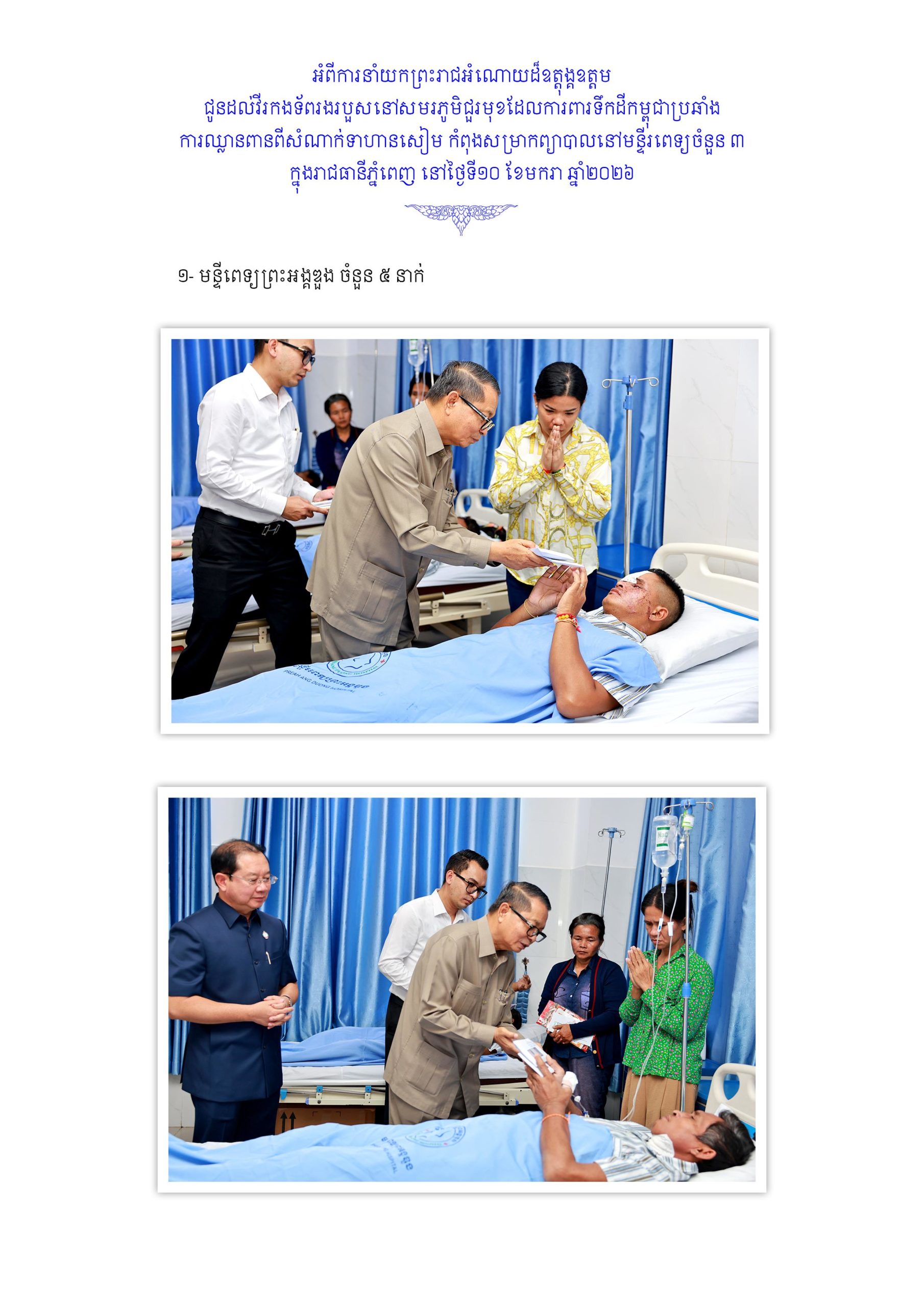 ព្រះមហាក្សត្រ សព្វព្រះរាជហឫទ័យយាងសួរសុខទុក្ខវីរៈកងទ័ពសមរភូមិជួរមុខ ដែលសម្រាកព្យាបាលនៅមន្ទីរពេទ្យព្រះកេតុមាលា Posted on ថ្ងៃសៅរ៍, 10 ខែមករា, 2026ថ្ងៃសៅរ៍, 10 ខែមករា, 2026