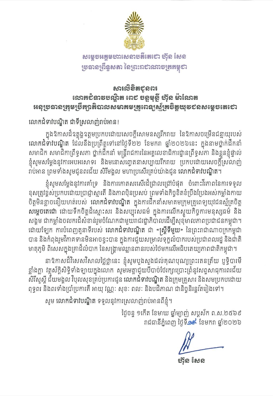 សម្តេចតេជោ ហ៊ុន សែន ផ្ញើសារលិខិតជូនពរ ជូនលោកជំទាវបណ្ឌិត ពេជ ចន្ទមុន្នី ហ៊ុន ម៉ាណែត ក្នុងឱកាសខួបចម្រើនជន្មាយុ នាថ្ងៃទី២២ ខែមករា ឆ្នាំ២០២៦ Posted on ថ្ងៃចន្ទ, 19 ខែមករា, 2026ថ្ងៃចន្ទ, 19 ខែមករា, 2026