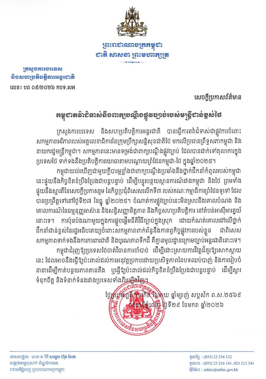 កម្ពុជា ប្រឆាំងតវ៉ាជំទាស់នឹងពាក្យបណ្តឹងផ្លូវច្បាប់របស់មន្ត្រីជាន់ខ្ពស់ថៃ Posted on ថ្ងៃព្រហស្បតិ៍, 29 ខែមករា, 2026ថ្ងៃព្រហស្បតិ៍, 29 ខែមករា, 2026