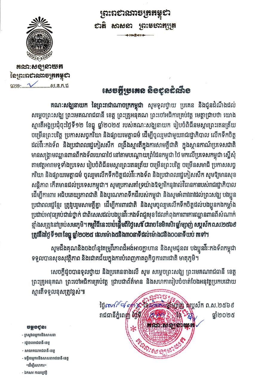 គណៈសង្ឃនាយក ប្រកាសឱ្យរៀបចំ «សច្ចកិរិយា» នៅគ្រប់វត្តអារាមទូទាំងប្រទេសនាល្ងាចនេះ ដើម្បីលើកទឹកចិត្តដល់វីរៈកងទ័ព និងជនភៀសសឹក Posted on ថ្ងៃសៅរ៍, 13 ខែធ្នូ, 2025ថ្ងៃសៅរ៍, 13 ខែធ្នូ, 2025
