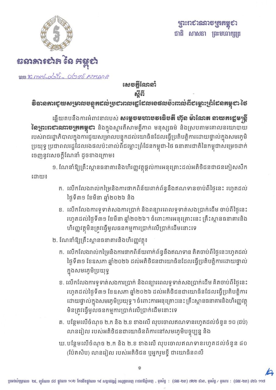 ធនាគារជាតិនៃកម្ពុជា ចេញសេចក្ដីណែនាំពីវិធានការជួយសម្រាលបន្ទុក ដល់ប្រជាពលរដ្ឋដែលរងផលប៉ះពាល់ពីជម្លោះព្រំដែនកម្ពុជា-ថៃ Posted on ថ្ងៃពុធ, 10 ខែធ្នូ, 2025ថ្ងៃពុធ, 10 ខែធ្នូ, 2025