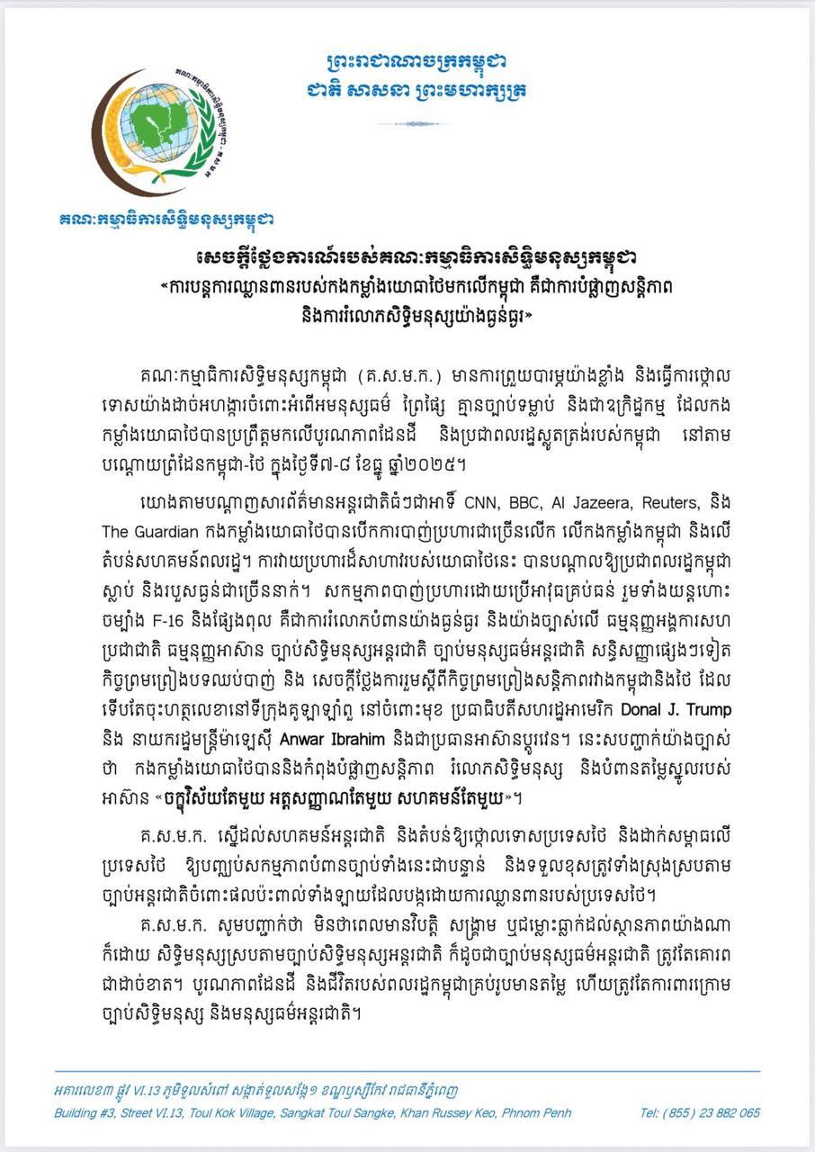 គណៈកម្មាធិការសិទ្ធិមនុស្សកម្ពុជា៖ ការបន្តការឈ្លានពានរបស់កងកម្លាំងយោធាថៃ មកលើកម្ពុជា ជាការបំផ្លាញសន្តិភាព និងការរំលោភសិទ្ធិមនុស្សយ៉ាងធ្ងន់ធ្ងរ, ស្នើដល់សហគមន៍អន្តរជាតិ ដាក់សម្ពាធថៃ ឱ្យបញ្ឈប់ជាបន្ទាន់ Posted on ថ្ងៃចន្ទ, 8 ខែធ្នូ, 2025ថ្ងៃចន្ទ, 8 ខែធ្នូ, 2025