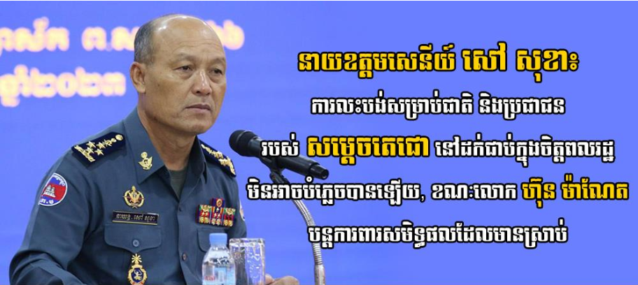 នាយឧត្តមសេនីយ៍ សៅ សុខា៖ ការលះបង់សម្រាប់ជាតិ និងប្រជាជនរបស់សម្ដេចតេជោ នៅដក់ជាប់ក្នុងចិត្ដពលរដ្ឋមិនអាចបំភ្លេចបានឡើយ ខណៈឯកឧត្តម ហ៊ុន ម៉ាណែត បន្តការពារសមិទ្ធផលដែលមានស្រាប់ និងបន្ដកសាងថ្មី Posted on ថ្ងៃព្រហស្បតិ៍, 27 ខែកក្កដា, 2023ថ្ងៃព្រហស្បតិ៍, 27 ខែកក្កដា, 2023