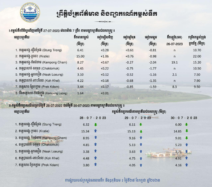 ក្រសួងធនធានទឹក បញ្ជាក់ស្ថានភាពកម្ពស់ទឹក នៅតាមស្ថានីយជលសាស្ត្រនានានៅកម្ពុជា ប្រចាំថ្ងៃទី២៧ ខែកក្កដានេះ Posted on ថ្ងៃព្រហស្បតិ៍, 27 ខែកក្កដា, 2023ថ្ងៃព្រហស្បតិ៍, 27 ខែកក្កដា, 2023