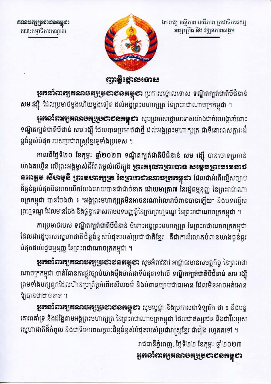 ញត្តិថ្កោលទោស ទណ្ឌិតក្បត់ជាតិបីជំនាន់ សម រង្ស៊ី ដែលប្រមាថម្តងហើយម្តងទៀត ដល់អង្គព្រះមហាក្សត្រ នៃព្រះរាជាណាចក្រកម្ពុជា Posted on ថ្ងៃពុធ, 22 ខែកុម្ភៈ, 2023ថ្ងៃពុធ, 22 ខែកុម្ភៈ, 2023