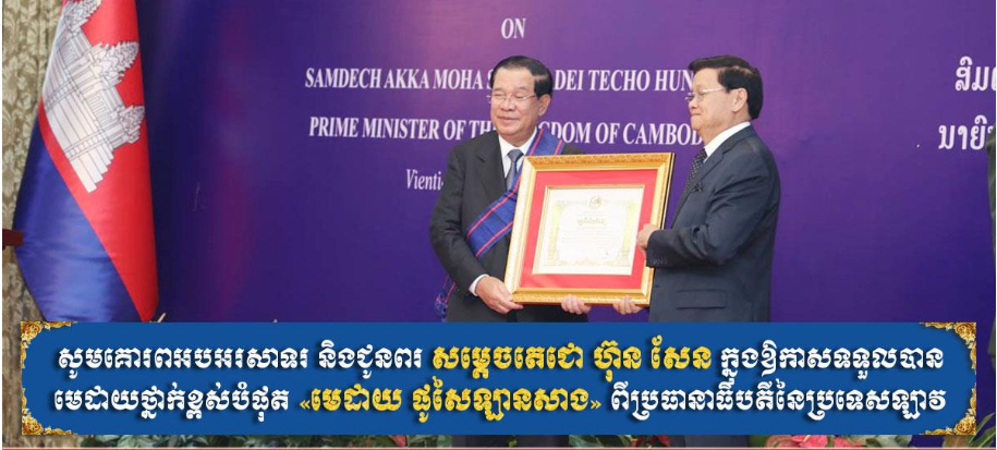ឡាវ នឹងផ្តល់មេដាយថ្នាក់ខ្ពស់បំផុតមួយជូន សម្តេចតេជោ ហ៊ុន សែន ដែលបានរួមចំណែកកសាងទំនាក់ទំនងល្អជាមួយឡាវ Posted on ថ្ងៃចន្ទ, 13 ខែកុម្ភៈ, 2023ថ្ងៃចន្ទ, 13 ខែកុម្ភៈ, 2023