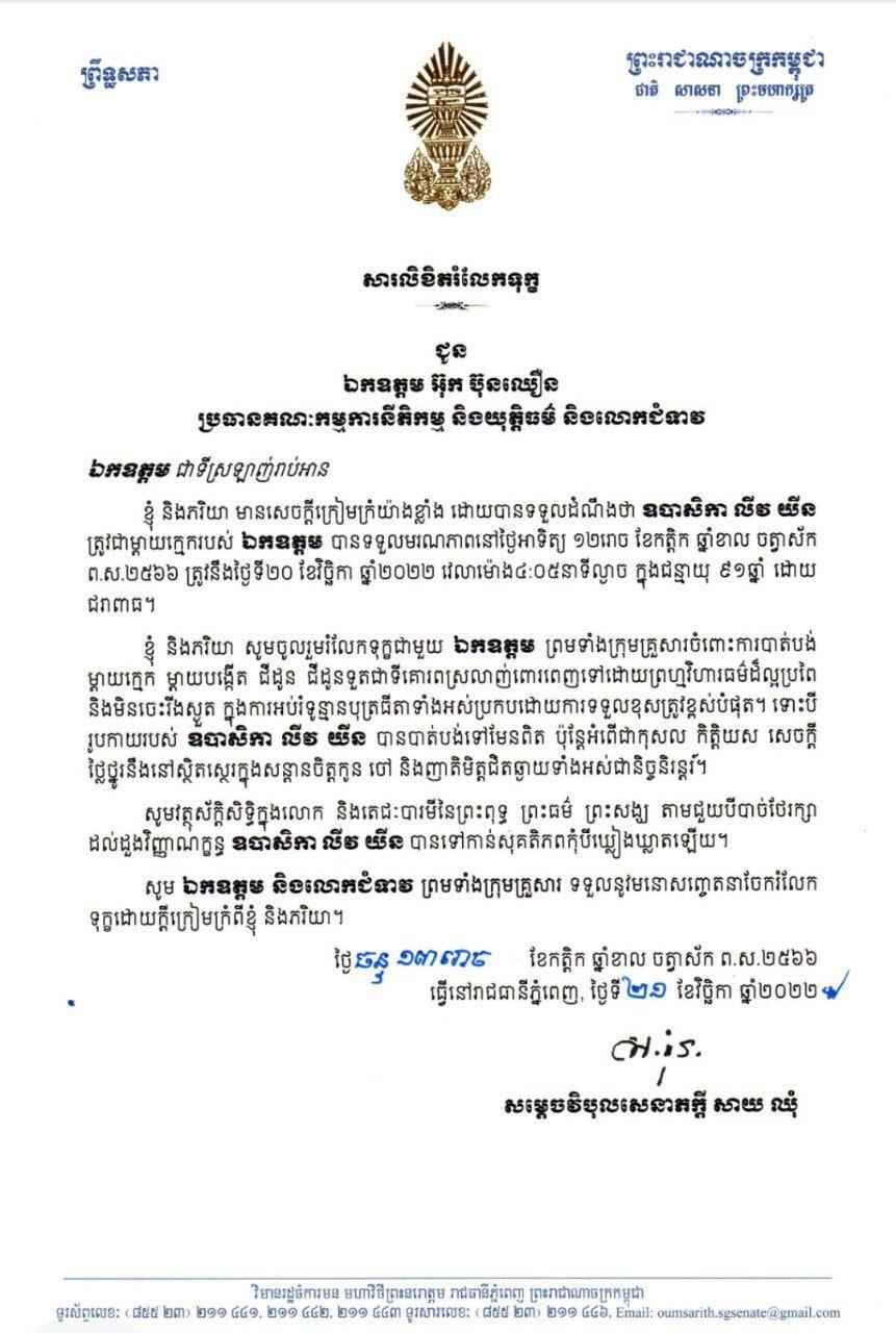 សម្ដេចវិបុលសេនាភក្តី សាយ ឈុំ ផ្ញើសារលិខិតរំលែកទុក្ខចំពោះមរណភាព ឧបាសិកា លីវ យីន Posted on ថ្ងៃអង្គារ, 22 ខែវិច្ឆិកា, 2022ថ្ងៃអង្គារ, 22 ខែវិច្ឆិកា, 2022