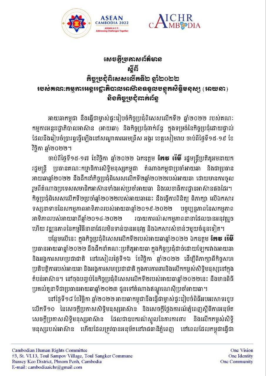 ស្អែកនេះ កម្ពុជានឹងធ្វើជាម្ចាស់ផ្ទះកិច្ចប្រជុំពិសេសលើកទី២ របស់គណៈកម្មការអន្តររដ្ឋាភិបាលអាស៊ានទទួលបន្ទុកសិទ្ធិមនុស្ស និងកិច្ចប្រជុំពាក់ព័ន្ធ Posted on ថ្ងៃអង្គារ, 15 ខែវិច្ឆិកា, 2022ថ្ងៃអង្គារ, 15 ខែវិច្ឆិកា, 2022