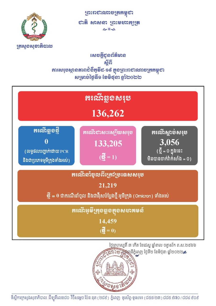 ក្រសួងសុខាភិបាល៖ ថ្ងៃនេះកម្ពុជាគ្មានអ្នកឆ្លងជំងឺកូវីដ១៩នោះទេ ២៦ថ្ងៃជាប់គ្នាហើយដែលគ្មានអ្នកឆ្លងថ្មី ខណៈអ្នកជាសះស្បើយ១នាក់ Posted on ថ្ងៃព្រហស្បតិ៍, 2 ខែមិថុនា, 2022ថ្ងៃព្រហស្បតិ៍, 2 ខែមិថុនា, 2022
