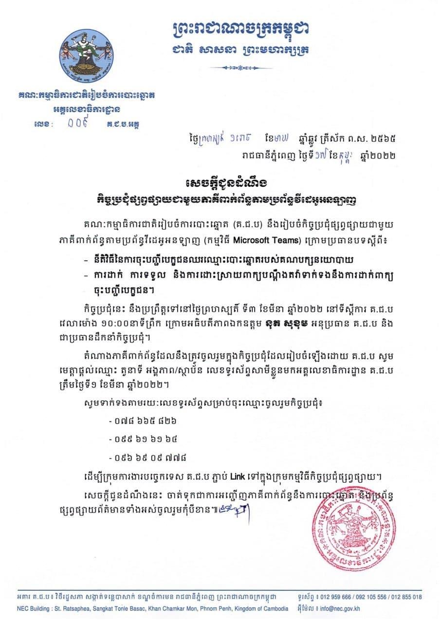 គ.ជ.ប នឹងកិច្ចប្រជុំផ្សព្វផ្សាយជាមួយភាគីពាក់ព័ន្ធ នៅដើមខែមីនា តាមប្រព័ន្ធវីដេអូអនឡាញ Posted on ថ្ងៃចន្ទ, 21 ខែកុម្ភៈ, 2022ថ្ងៃចន្ទ, 21 ខែកុម្ភៈ, 2022