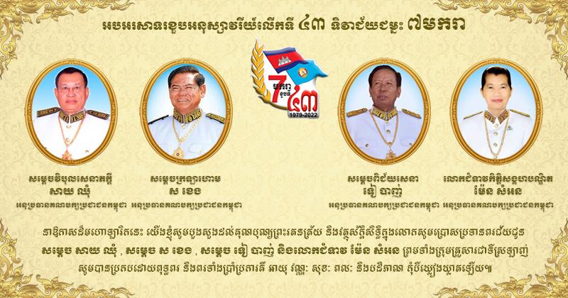 ឯកឧត្ដម ស៊ុយ សែម ផ្ញើសារលិខិតគោរពជូនពរ សម្ដេច សាយ ឈុំ , សម្ដេច ស ខេង , សម្ដេច ទៀ បាញ់ និងលោកជំទាវ ម៉ែន សំអន ក្នុងឱកាសខួបលើកទី៤៣ ទិវាជ័យជម្នះ ៧មករា Posted on ថ្ងៃព្រហស្បតិ៍, 6 ខែមករា, 2022ថ្ងៃព្រហស្បតិ៍, 6 ខែមករា, 2022