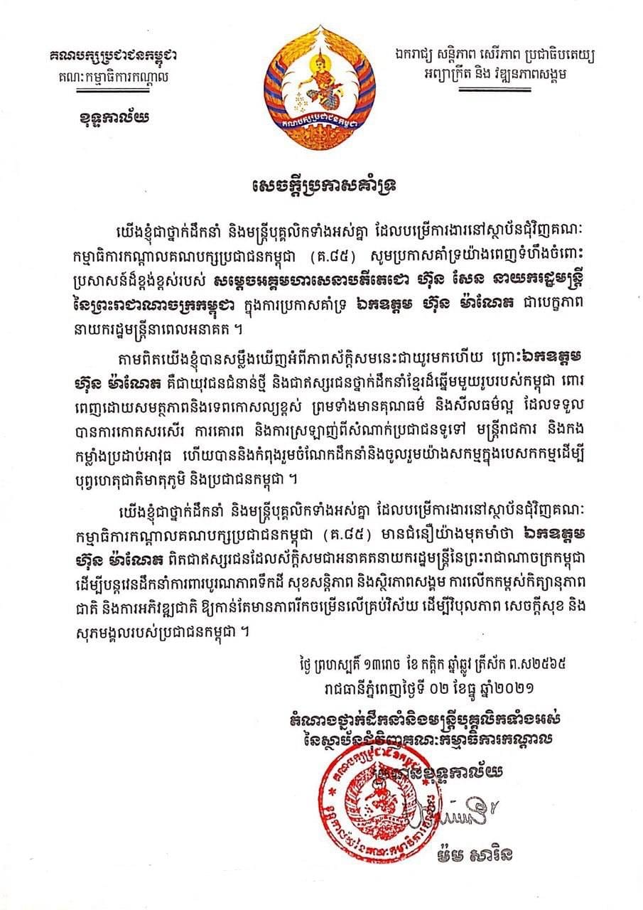 ក្នុងនាមជាថ្នាក់ដឹកនាំ និងមន្ត្រីដែលបម្រើការងារនៅស្ថាប័នជុំវិញគណ:កម្មាធិការកណ្តាលគណបក្សប្រជាជនកម្ពុជា (គ ៨៥) សូមគាំទ្រយ៉ាងពេញទំហឹងជាសាធារណ:ចំពោះប្រសាសន៍របស់សម្តេចតេជោ ហ៊ុន សែន ប្រកាសគាំទ្រ ឯកឧត្តម ហ៊ុន ម៉ាណែត ជាបេក្ខភាពនាយករដ្ឋមន្រ្តីនាពេលអនាគត Posted on ថ្ងៃសុក្រ, 3 ខែធ្នូ, 2021ថ្ងៃសុក្រ, 3 ខែធ្នូ, 2021