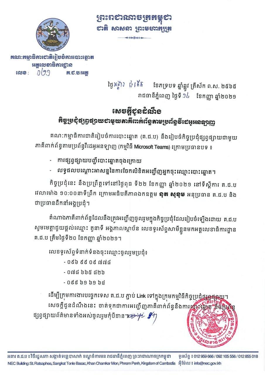 គ.ជ.ប នឹងរៀបចំកិច្ចប្រជុំផ្សព្វផ្សាយជាមួយភាគីពាក់ព័ន្ធ ក្រោមប្រធានបទចំនួន២ នៅថ្ងៃទី២២ ខែកញ្ញាខាងមុខ តាមប្រព័ន្ធវីដេអូ Posted on ថ្ងៃព្រហស្បតិ៍, 16 ខែកញ្ញា, 2021ថ្ងៃព្រហស្បតិ៍, 16 ខែកញ្ញា, 2021