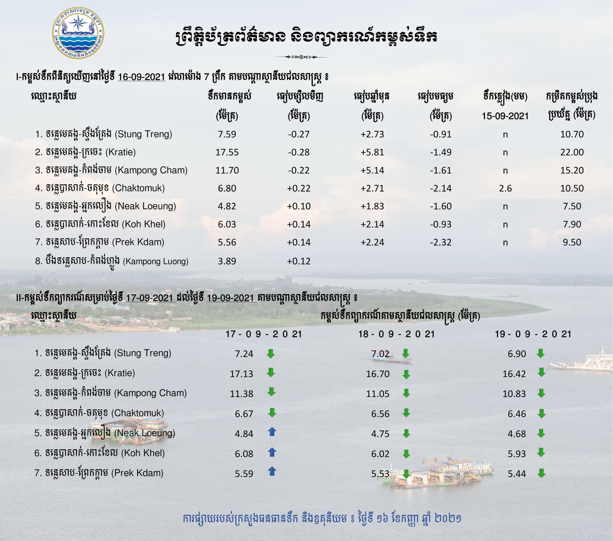 ក្រសួងធនធានទឹក បញ្ជាក់ស្ថានភាពកម្ពស់ទឹក នៅតាមស្ថានីយជលសាស្ត្រនានានៅកម្ពុជា ប្រចាំថ្ងៃទី១៦ ខែកញ្ញានេះ ! Posted on ថ្ងៃព្រហស្បតិ៍, 16 ខែកញ្ញា, 2021ថ្ងៃព្រហស្បតិ៍, 16 ខែកញ្ញា, 2021