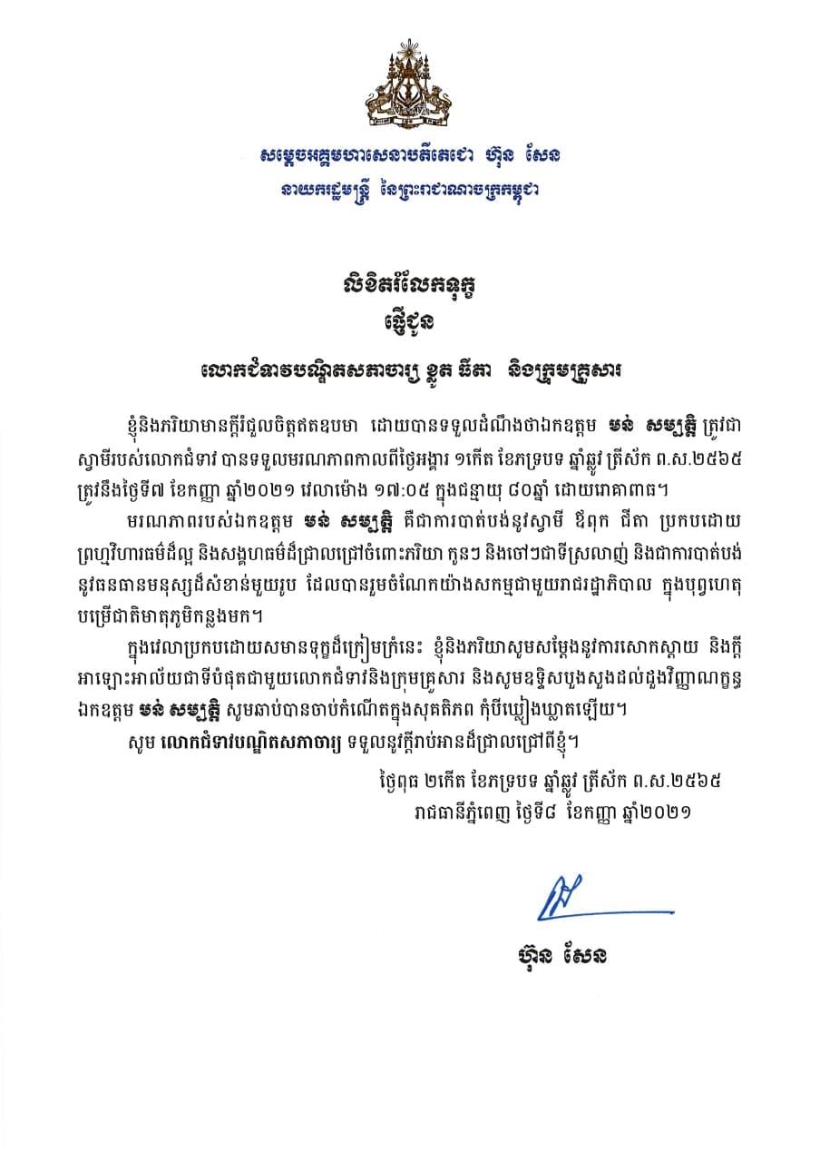 សម្តេចតេជោ ហ៊ុន សែន ផ្ញើលិខិតចូលរួមរំលែកទុក្ខជូនលោកជំទាវ បណ្ឌិតសភាចារ្យ ខ្លូត ធីតា និងក្រុមគ្រួសារ ចំពោះមរណភាពឯកឧត្តម មន់ សម្បត្តិ Posted on ថ្ងៃពុធ, 8 ខែកញ្ញា, 2021ថ្ងៃពុធ, 8 ខែកញ្ញា, 2021